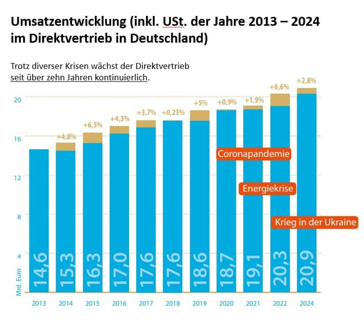 Außerdem bot die aktuelle Marktstudie der Universität Mannheim neueste Ergebnisse und Zahlen zur Situation des Direktvertriebs in Deutschland. In dieser Branche sind über 907.000 Menschen tätig. Im Jahr 2024 konnte der Umsatz von 20,89 Milliarden Euro trotz multipler gesamtwirtschaftlicher Herausforderungen stabil gehalten werden.